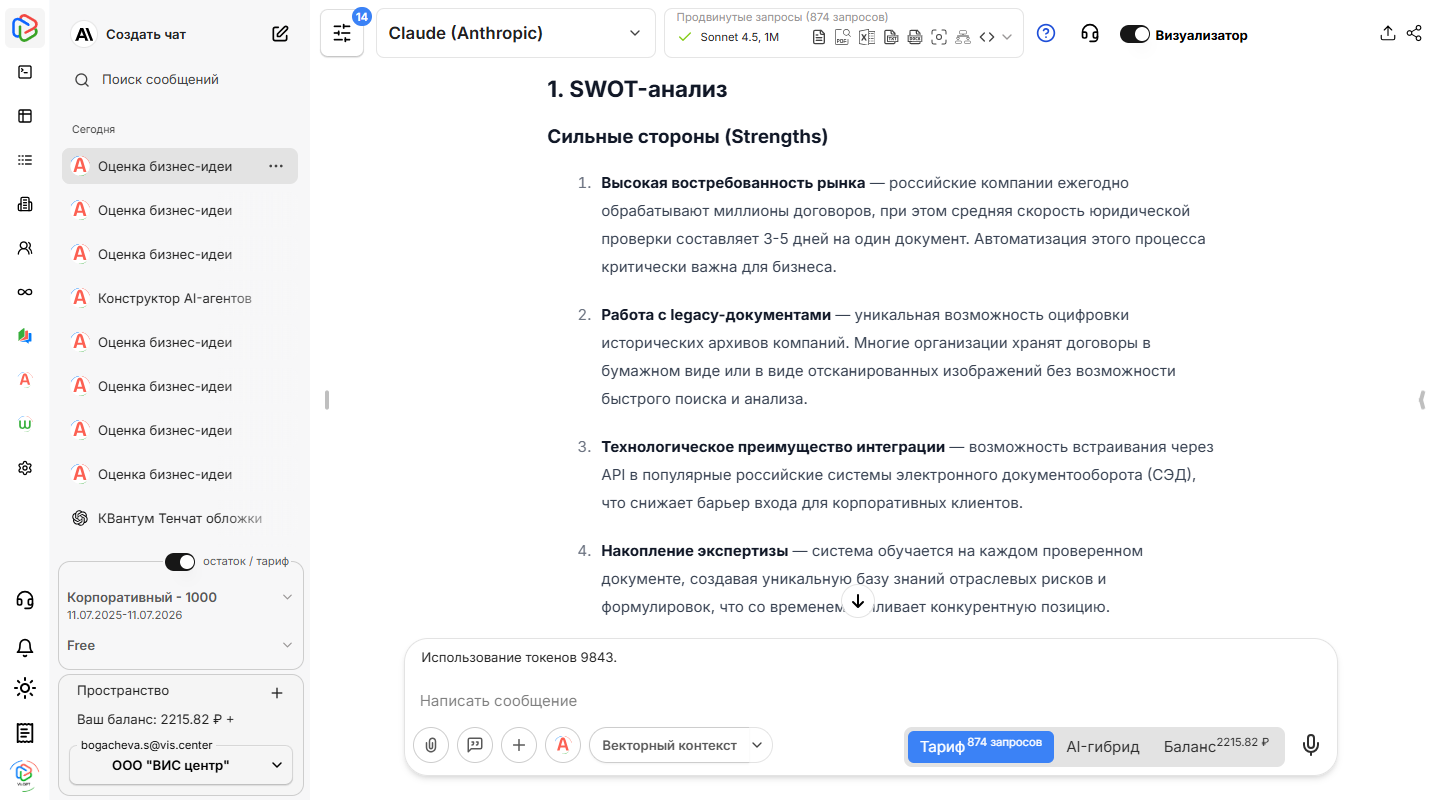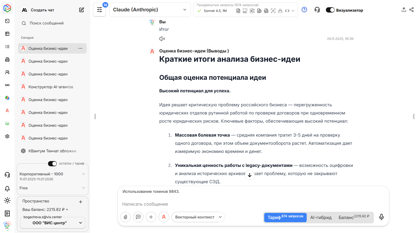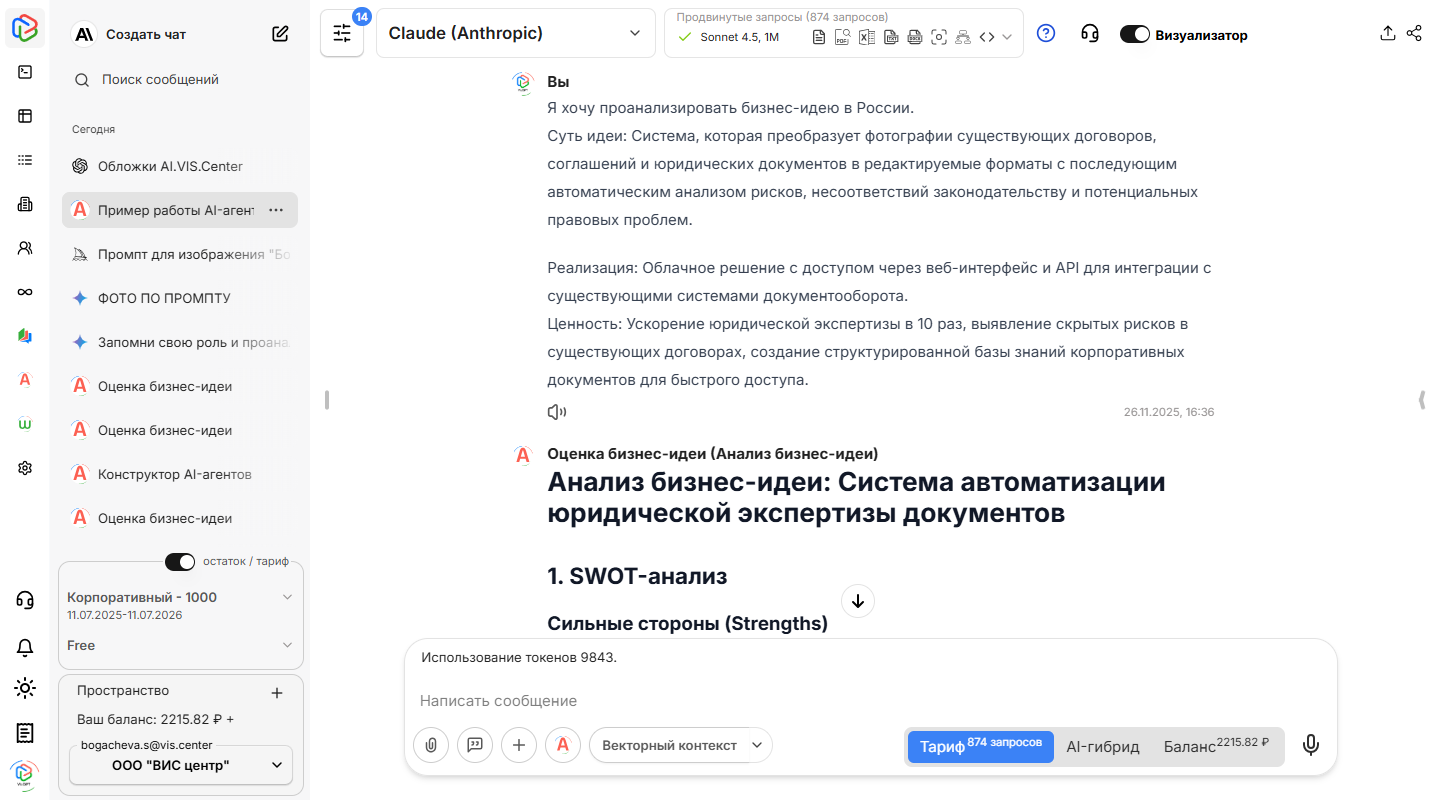 Представим, что вы загрузили AI-агенту "Оценка бизнес-идей" подробный анализ проекта по автоматизации юридической экспертизы документов. Этот ИИ-агент, созданный в VisGPT, оперативно проработает всю информацию и предоставит структурированные выводы.