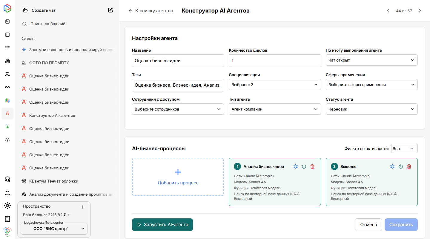 Создание AI-агента в VisGPT — это интуитивный процесс, который не требует навыков программирования. Рассмотрим процесс на примере создания ИИ-агента "Оценка бизнес-идей":