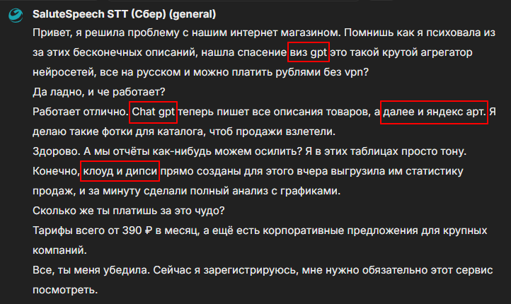 Мы решили сравнить, кто лучше справится с распознаванием диалога. Это телефонный разговор, который содержит технические слова, посмотрим какая нейросеть более точно их распознает.
