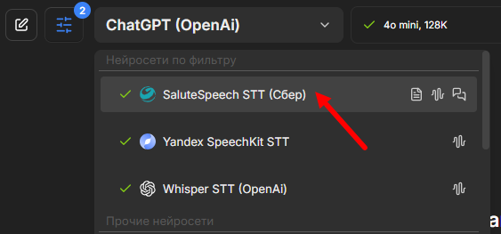 В этом же окне меняем нейросеть на Yandex SpeechKit: