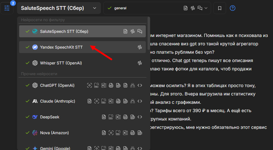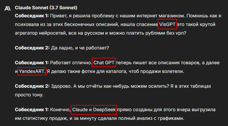 Теперь, чтобы превратить это в удобно читаемый диалог, возьмем самый удачный вариант от Salute и перейдем в нейросеть Claude. Мы как раз добавили новую продвинутую версию 3.7.