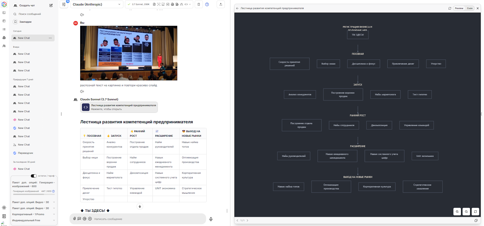 Claude 3.7 продемонстрировал впечатляющий подход – помимо распознавания текста, он создал табличное представление и дополнил его блок-схемой, визуализирующей взаимосвязи между элементами слайда, что особенно ценно для технического анализа.