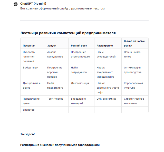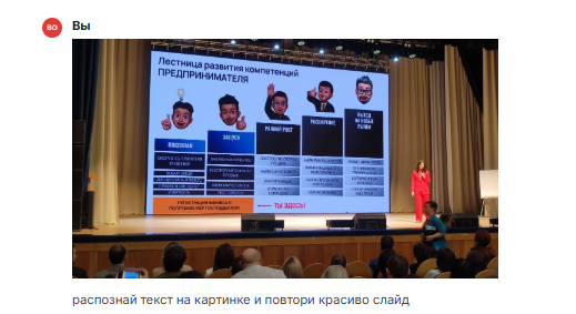 Вместо того, чтобы тратить часы на расшифровку или просить презентацию у организаторов (которую могут и не предоставить), современные инструменты искусственного интеллекта в сервисе VisGPT позволяют трансформировать даже низкокачественные снимки в структурированные данные и готовые к использованию материалы.