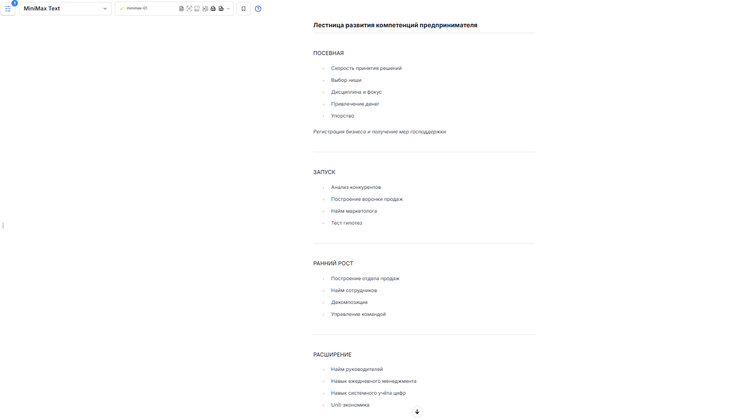 MiniMax Tex показал высокую скорость обработки, предоставив результат за доли секунды в виде структурированных текстовых блоков, что критично при работе в условиях ограниченного времени.