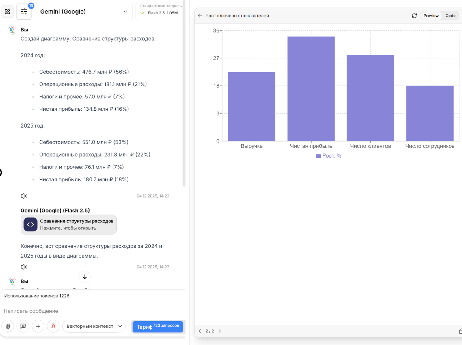 Когда нужно детально сравнить структуру расходов или динамику различных метрик — Gemini незаменим.