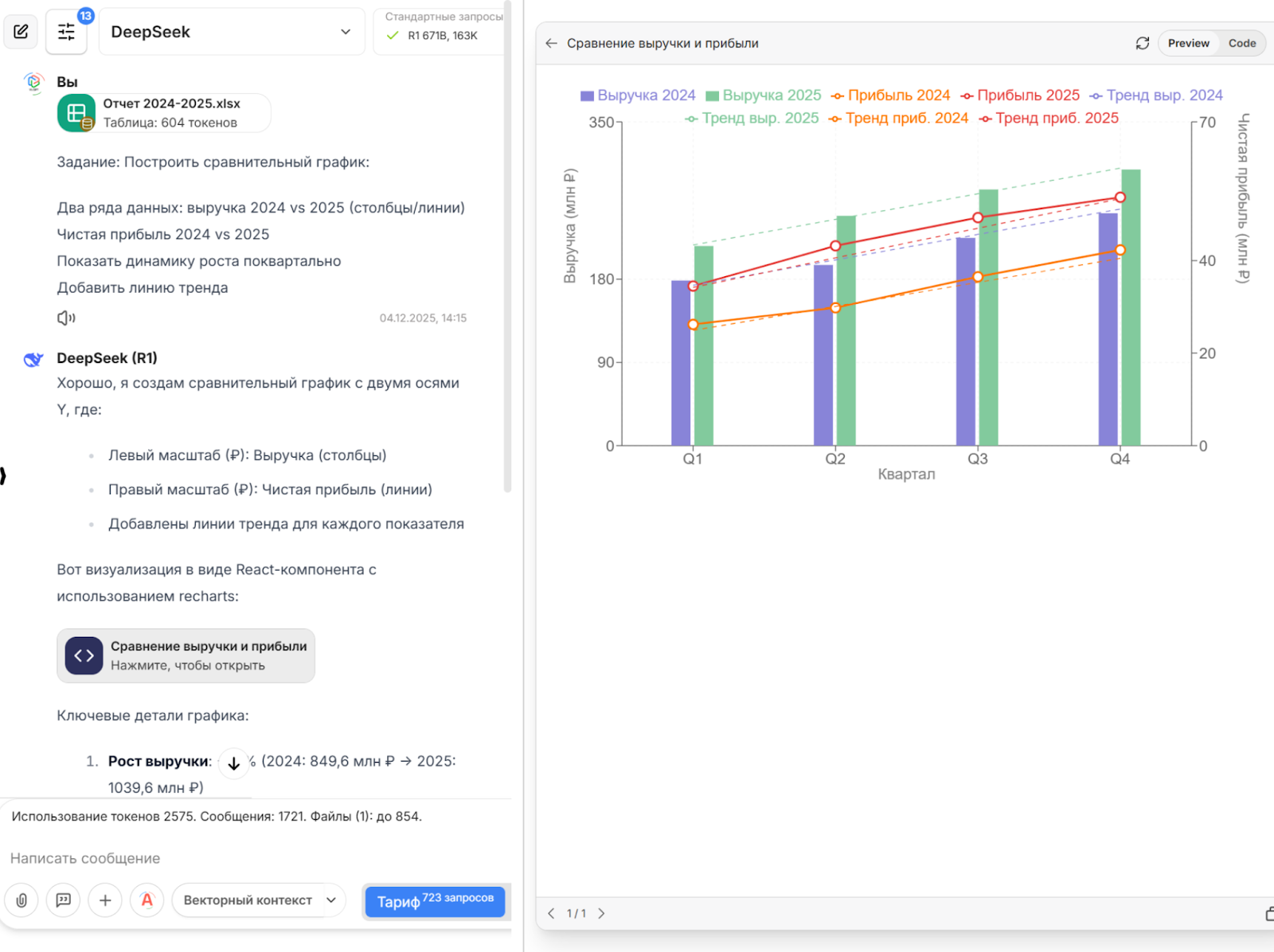 Пример: На основе финансовых данных DeepSeek построил сравнительный график выручки и чистой прибыли за все кварталы 2024-2025 годов, добавив линии тренда. Наглядно показан общий устойчивый рост, а также квартал с максимальным приростом в +27,2% по выручке. Такой подход с нейросетями для бизнес-аналитики значительно упрощает восприятие сложных финансовых показателей, делая ваш отчет более убедительным.