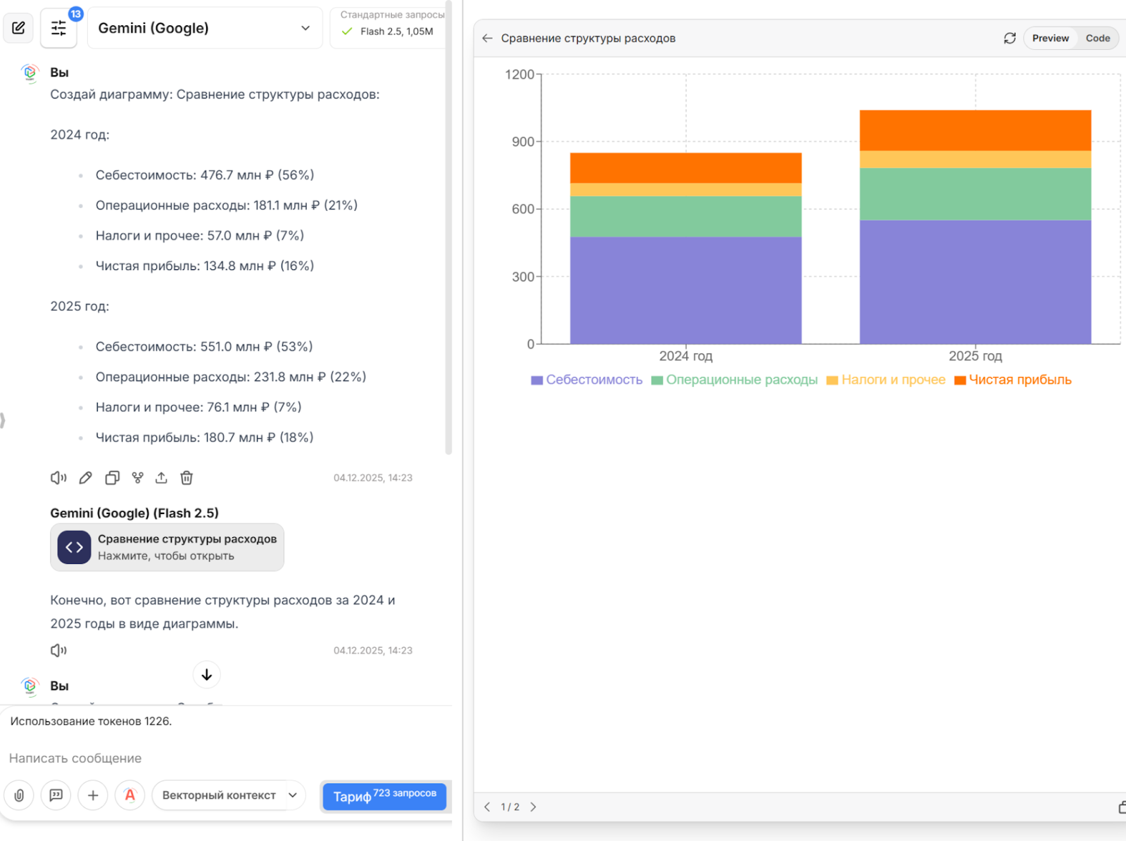 Пример: Gemini создал диаграммы, показывающие, как изменилась структура расходов на себестоимость, операционные расходы и налоги между 2024 и 2025 годами.