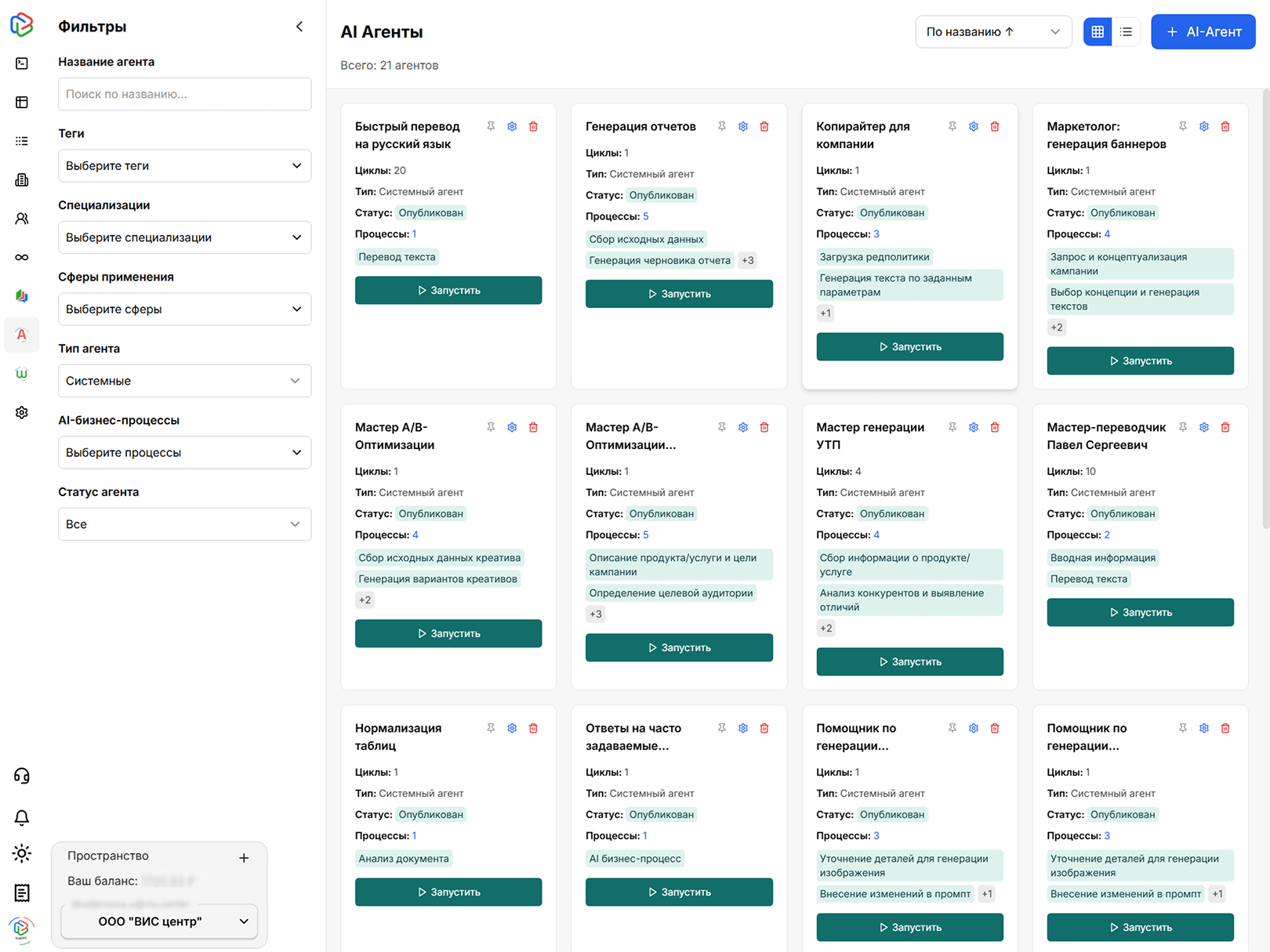 Выберите подходящего агента из библиотеки, и он сам проведет вас через все необходимые этапы работы.